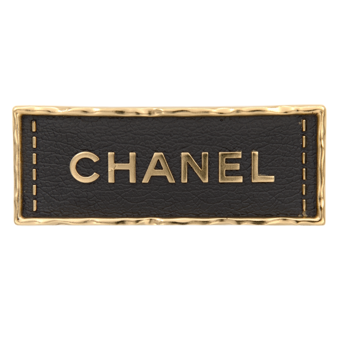 A chic and modern Chanel statement piece. This brooch features a black leather plaque framed in hammered gold-tone metal, finished with bold CHANEL lettering. The stitched-effect detailing adds a subtle touch of craftsmanship, making it both striking and timeless.