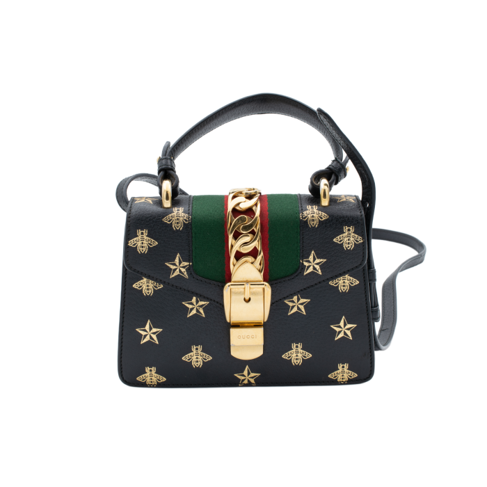 Gucci Calfskin Bee Star Print Mini Sylvie Top Handle Bag Black