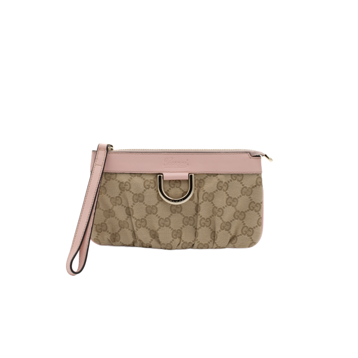 The Gucci GG Canvas wristlet in beige and pink — a feminine take on one of the house’s most timeless designs. Crafted from the signature GG monogram canvas and finished with blush pink leather trim and silver-tone hardware, this compact clutch adds an elegant touch to both day and evening looks.