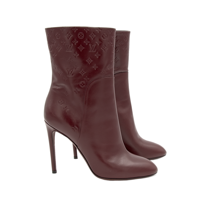 A striking blend of sophistication and modern luxury. These Louis Vuitton ankle boots come in a deep burgundy leather, subtly embossed with the iconic Monogram pattern for an elevated, understated look.